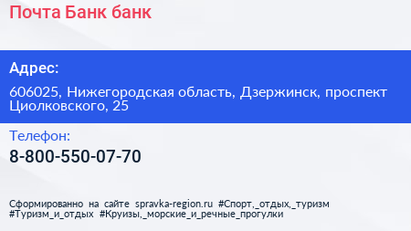 Почта Банк, банк по адресу 606025, Нижегородская область, Дзержинск, проспект Циолковского, 25 в дальнейшем Организация, размещена в следующих категориях: