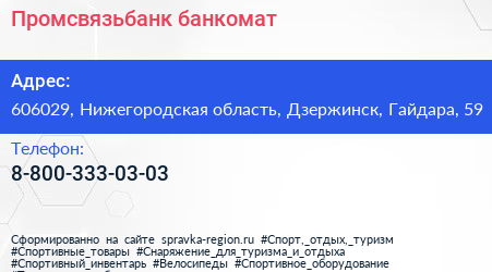 Промсвязьбанк, банкомат по адресу 606029, Нижегородская область, Дзержинск, Гайдара, 59 в дальнейшем Организация, размещена в следующих категориях: