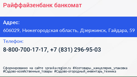 Райффайзенбанк, банкомат по адресу 606029, Нижегородская область, Дзержинск, Гайдара, 59 в дальнейшем Организация, размещена в следующих категориях:
