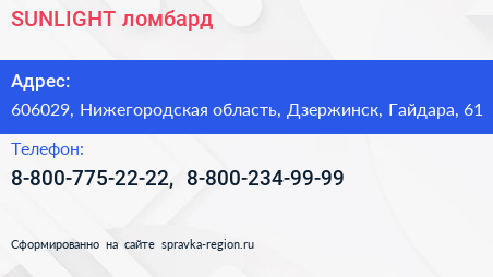 SUNLIGHT, ломбард по адресу 606029, Нижегородская область, Дзержинск, Гайдара, 61 в дальнейшем Организация, размещена в следующих категориях: