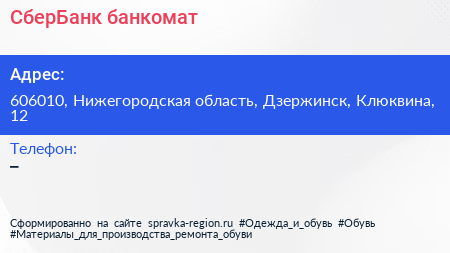 СберБанк, банкомат по адресу 606010, Нижегородская область, Дзержинск, Клюквина, 12 в дальнейшем Организация, размещена в следующих категориях: