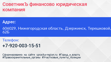 СоветникЪ, финансово-юридическая компания по адресу 606029, Нижегородская область, Дзержинск, Терешковой, 62Б в дальнейшем Организация, размещена в следующих категориях: