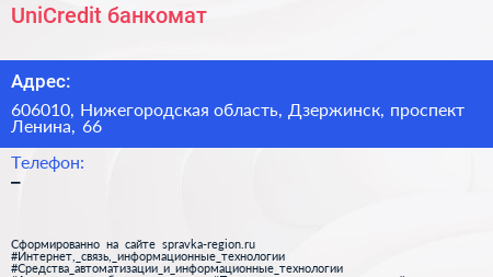 UniCredit, банкомат по адресу 606010, Нижегородская область, Дзержинск, проспект Ленина, 66 в дальнейшем Организация, размещена в следующих категориях: