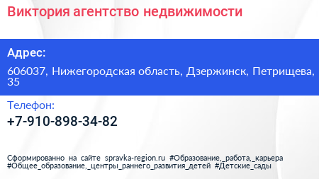 Виктория, агентство недвижимости по адресу 606037, Нижегородская область, Дзержинск, Петрищева, 35 в дальнейшем Организация, размещена в следующих категориях: