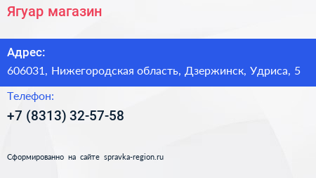 Ягуар, магазин по адресу 606031, Нижегородская область, Дзержинск, Удриса, 5 в дальнейшем Организация, размещена в следующих категориях: