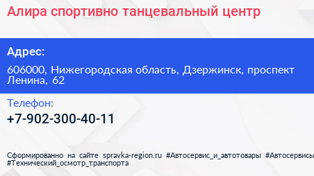 Алира, спортивно-танцевальный центр по адресу 606000, Нижегородская область, Дзержинск, проспект Ленина, 62 в дальнейшем Организация, размещена в следующих категориях: