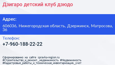 Дзигаро, детский клуб дзюдо по адресу 606036, Нижегородская область, Дзержинск, Матросова, 36 в дальнейшем Организация, размещена в следующих категориях: