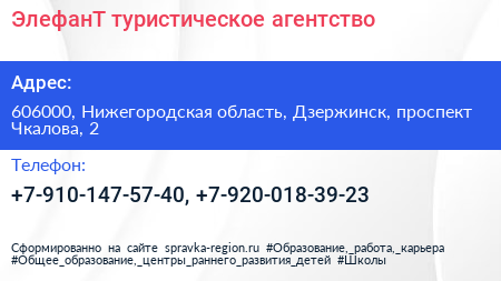 ЭлефанТ, туристическое агентство по адресу 606000, Нижегородская область, Дзержинск, проспект Чкалова, 2 в дальнейшем Организация, размещена в следующих категориях: