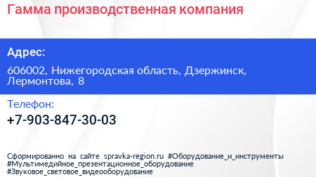 Гамма, производственная компания по адресу 606002, Нижегородская область, Дзержинск, Лермонтова, 8 в дальнейшем Организация, размещена в следующих категориях: