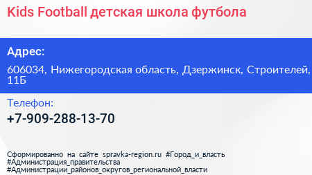 Kids Football, детская школа футбола по адресу 606034, Нижегородская область, Дзержинск, Строителей, 11Б в дальнейшем Организация, размещена в следующих категориях:
