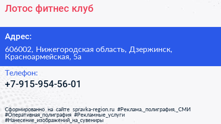 Лотос, фитнес-клуб по адресу 606002, Нижегородская область, Дзержинск, Красноармейская, 5а в дальнейшем Организация, размещена в следующих категориях: