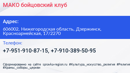 МАКО, бойцовский клуб по адресу 606002, Нижегородская область, Дзержинск, Красноармейская, 17/2270 в дальнейшем Организация, размещена в следующих категориях: