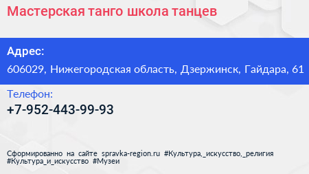 Мастерская танго, школа танцев по адресу 606029, Нижегородская область, Дзержинск, Гайдара, 61 в дальнейшем Организация, размещена в следующих категориях:
