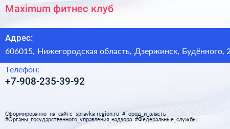 Maximum, фитнес-клуб по адресу 606015, Нижегородская область, Дзержинск, Будённого, 2 в дальнейшем Организация, размещена в следующих категориях: