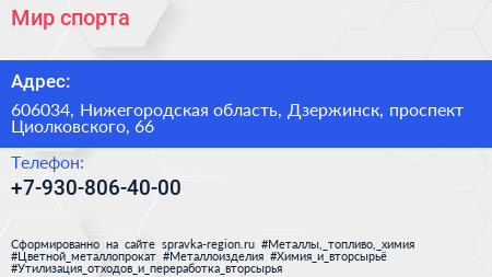 Мир спорта по адресу 606034, Нижегородская область, Дзержинск, проспект Циолковского, 66 в дальнейшем Организация, размещена в следующих категориях: