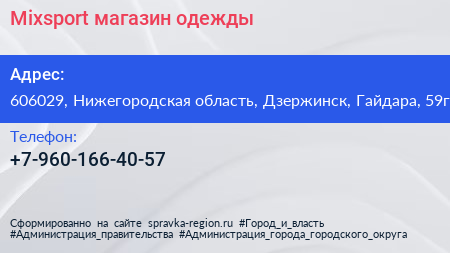 Mixsport, магазин одежды по адресу 606029, Нижегородская область, Дзержинск, Гайдара, 59г в дальнейшем Организация, размещена в следующих категориях: