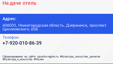 На даче, отель по адресу 606031, Нижегородская область, Дзержинск, проспект Циолковского, 65Б в дальнейшем Организация, размещена в следующих категориях: