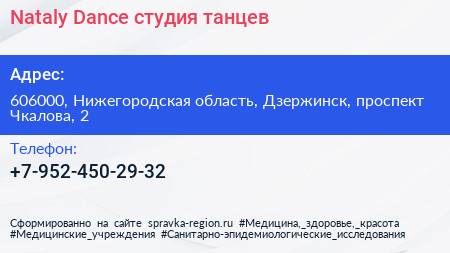 Nataly Dance, студия танцев по адресу 606000, Нижегородская область, Дзержинск, проспект Чкалова, 2 в дальнейшем Организация, размещена в следующих категориях: