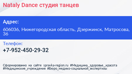 Nataly Dance, студия танцев по адресу 606036, Нижегородская область, Дзержинск, Матросова, 36 в дальнейшем Организация, размещена в следующих категориях: