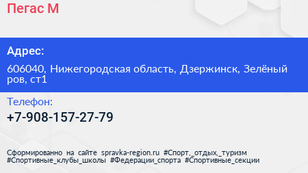 Пегас М по адресу 606040, Нижегородская область, Дзержинск, Зелёный ров, ст1 в дальнейшем Организация, размещена в следующих категориях: