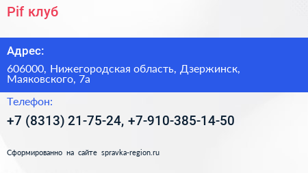 Pif-клуб по адресу 606000, Нижегородская область, Дзержинск, Маяковского, 7а в дальнейшем Организация, размещена в следующих категориях: