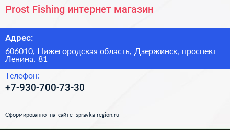 Prost Fishing, интернет-магазин по адресу 606010, Нижегородская область, Дзержинск, проспект Ленина, 81 в дальнейшем Организация, размещена в следующих категориях: