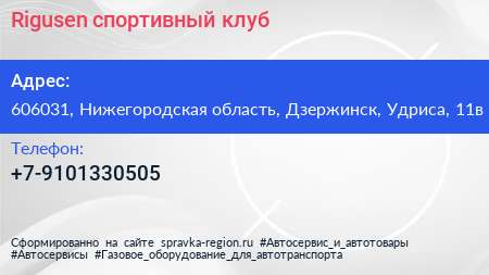 Rigusen, спортивный клуб по адресу 606031, Нижегородская область, Дзержинск, Удриса, 11в в дальнейшем Организация, размещена в следующих категориях: