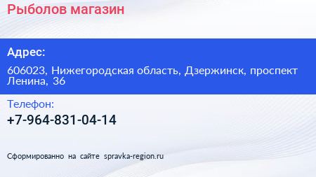 Рыболов, магазин по адресу 606023, Нижегородская область, Дзержинск, проспект Ленина, 36 в дальнейшем Организация, размещена в следующих категориях: