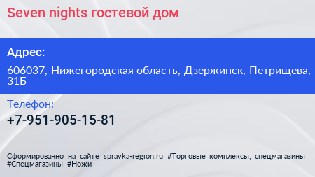 Seven nights, гостевой дом по адресу 606037, Нижегородская область, Дзержинск, Петрищева, 31Б в дальнейшем Организация, размещена в следующих категориях: