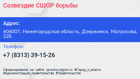 Созвездие, СШОР борьбы по адресу 606007, Нижегородская область, Дзержинск, Матросова, 22Б в дальнейшем Организация, размещена в следующих категориях: