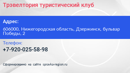 Трэвелтория, туристический клуб по адресу 606000, Нижегородская область, Дзержинск, бульвар Победы, 2 в дальнейшем Организация, размещена в следующих категориях: