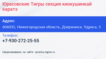 Юрасовские Тигры, секция киокушинкай каратэ по адресу 606031, Нижегородская область, Дзержинск, Удриса, 5 в дальнейшем Организация, размещена в следующих категориях:
