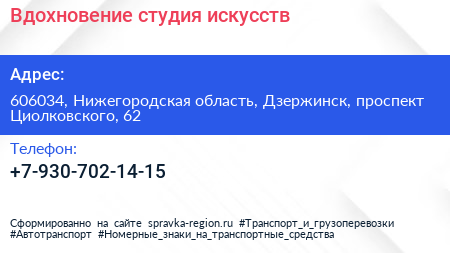 Вдохновение, студия искусств по адресу 606034, Нижегородская область, Дзержинск, проспект Циолковского, 62 в дальнейшем Организация, размещена в следующих категориях: