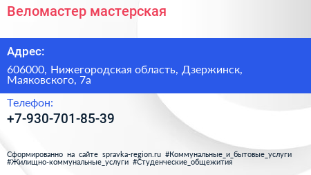 Веломастер, мастерская по адресу 606000, Нижегородская область, Дзержинск, Маяковского, 7а в дальнейшем Организация, размещена в следующих категориях: