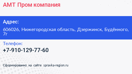 АМТ-Пром, компания по адресу 606026, Нижегородская область, Дзержинск, Будённого, 7г в дальнейшем Организация, размещена в следующих категориях: