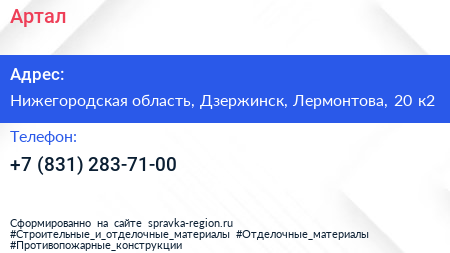 Артал по адресу Нижегородская область, Дзержинск, Лермонтова, 20 к2 в дальнейшем Организация, размещена в следующих категориях: