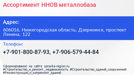 Ассортимент-ННОВ, металлобаза по адресу 606016, Нижегородская область, Дзержинск, проспект Ленина, 122 в дальнейшем Организация, размещена в следующих категориях: