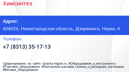 Химсинтез по адресу 606016, Нижегородская область, Дзержинск, Науки, 4 в дальнейшем Организация, размещена в следующих категориях: