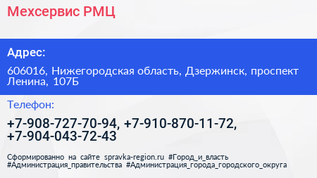 Мехсервис-РМЦ по адресу 606016, Нижегородская область, Дзержинск, проспект Ленина, 107Б в дальнейшем Организация, размещена в следующих категориях: