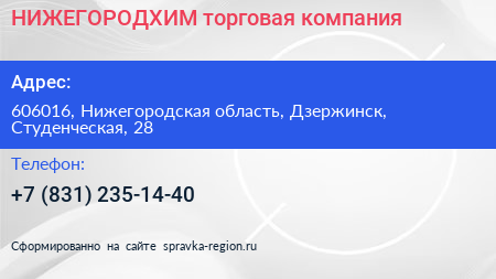 НИЖЕГОРОДХИМ, торговая компания по адресу 606016, Нижегородская область, Дзержинск, Студенческая, 28 в дальнейшем Организация, размещена в следующих категориях: