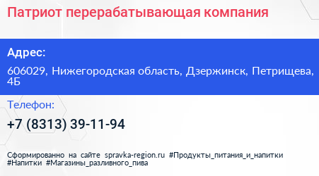 Патриот, перерабатывающая компания по адресу 606029, Нижегородская область, Дзержинск, Петрищева, 4Б в дальнейшем Организация, размещена в следующих категориях: