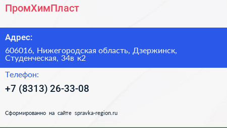ПромХимПласт по адресу 606016, Нижегородская область, Дзержинск, Студенческая, 34в к2 в дальнейшем Организация, размещена в следующих категориях: