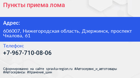 Пункты приема лома по адресу 606007, Нижегородская область, Дзержинск, проспект Чкалова, 61 в дальнейшем Организация, размещена в следующих категориях: