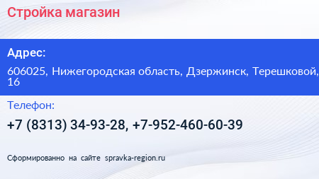 Стройка, магазин по адресу 606025, Нижегородская область, Дзержинск, Терешковой, 16 в дальнейшем Организация, размещена в следующих категориях: