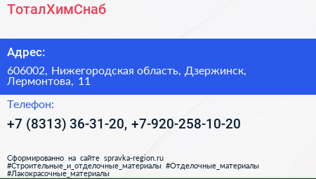 ТоталХимСнаб по адресу 606002, Нижегородская область, Дзержинск, Лермонтова, 11 в дальнейшем Организация, размещена в следующих категориях: