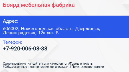 Боярд, мебельная фабрика по адресу 606002, Нижегородская область, Дзержинск, Ленинградская, 12а лит В в дальнейшем Организация, размещена в следующих категориях: