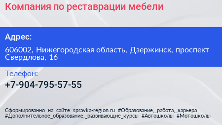 Компания по реставрации мебели по адресу 606002, Нижегородская область, Дзержинск, проспект Свердлова, 16 в дальнейшем Организация, размещена в следующих категориях: