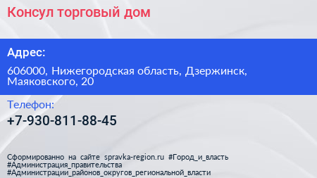 Консул, торговый дом по адресу 606000, Нижегородская область, Дзержинск, Маяковского, 20 в дальнейшем Организация, размещена в следующих категориях:
