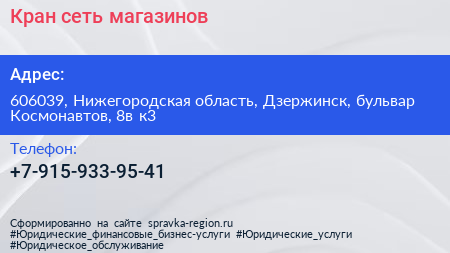 Кран, сеть магазинов по адресу 606039, Нижегородская область, Дзержинск, бульвар Космонавтов, 8в к3 в дальнейшем Организация, размещена в следующих категориях: