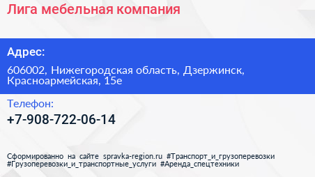 Лига, мебельная компания по адресу 606002, Нижегородская область, Дзержинск, Красноармейская, 15е в дальнейшем Организация, размещена в следующих категориях: